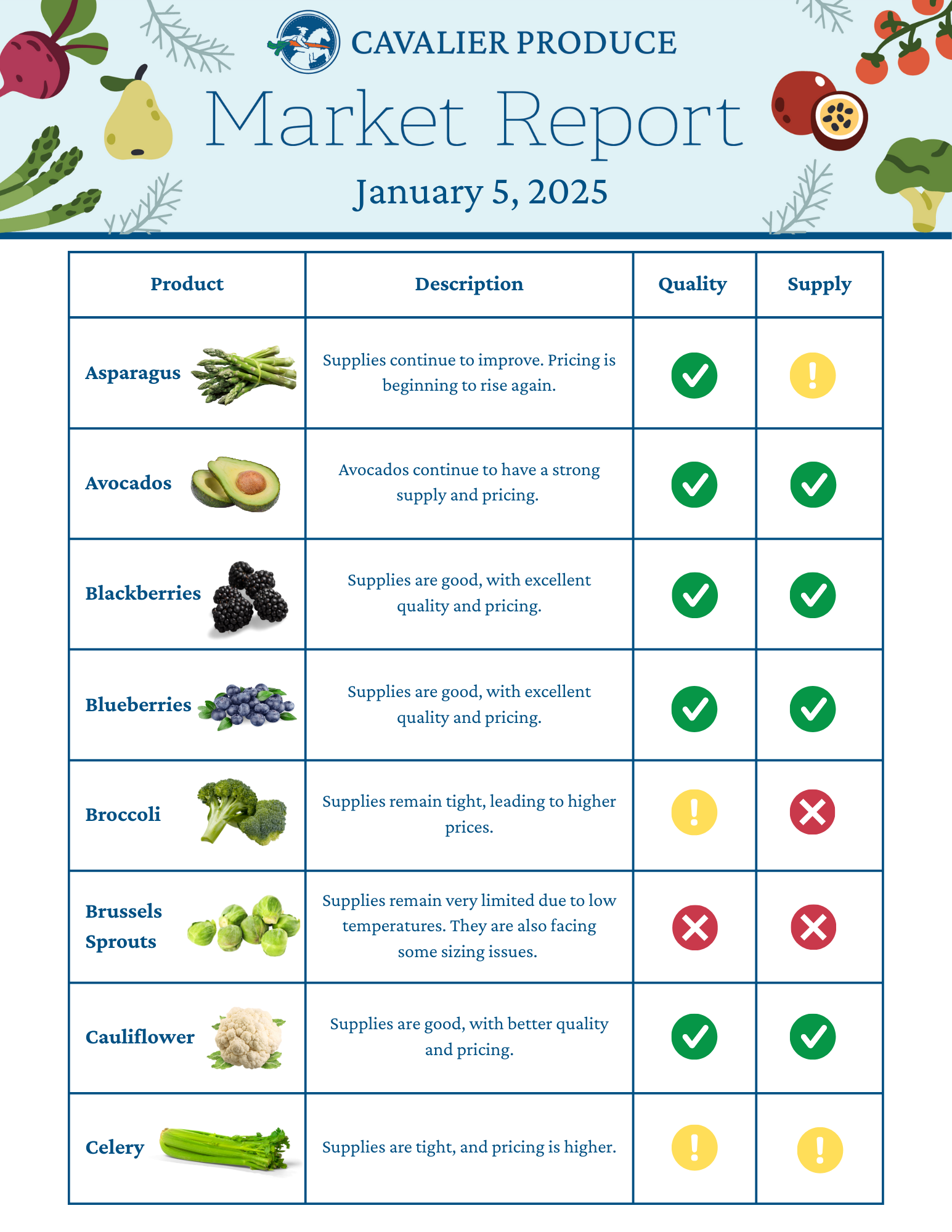 Welcome to this week’s Market Report from Cavalier Produce, your trusted wholesale produce distributor in Virginia. Each week, we share a visual snapshot of what’s available and what’s in peak season, with updates on quality and supply. Our goal as a local produce supplier is to help food buyers, chefs, and restaurant owners obtain the freshest produce to elevate their menu items.