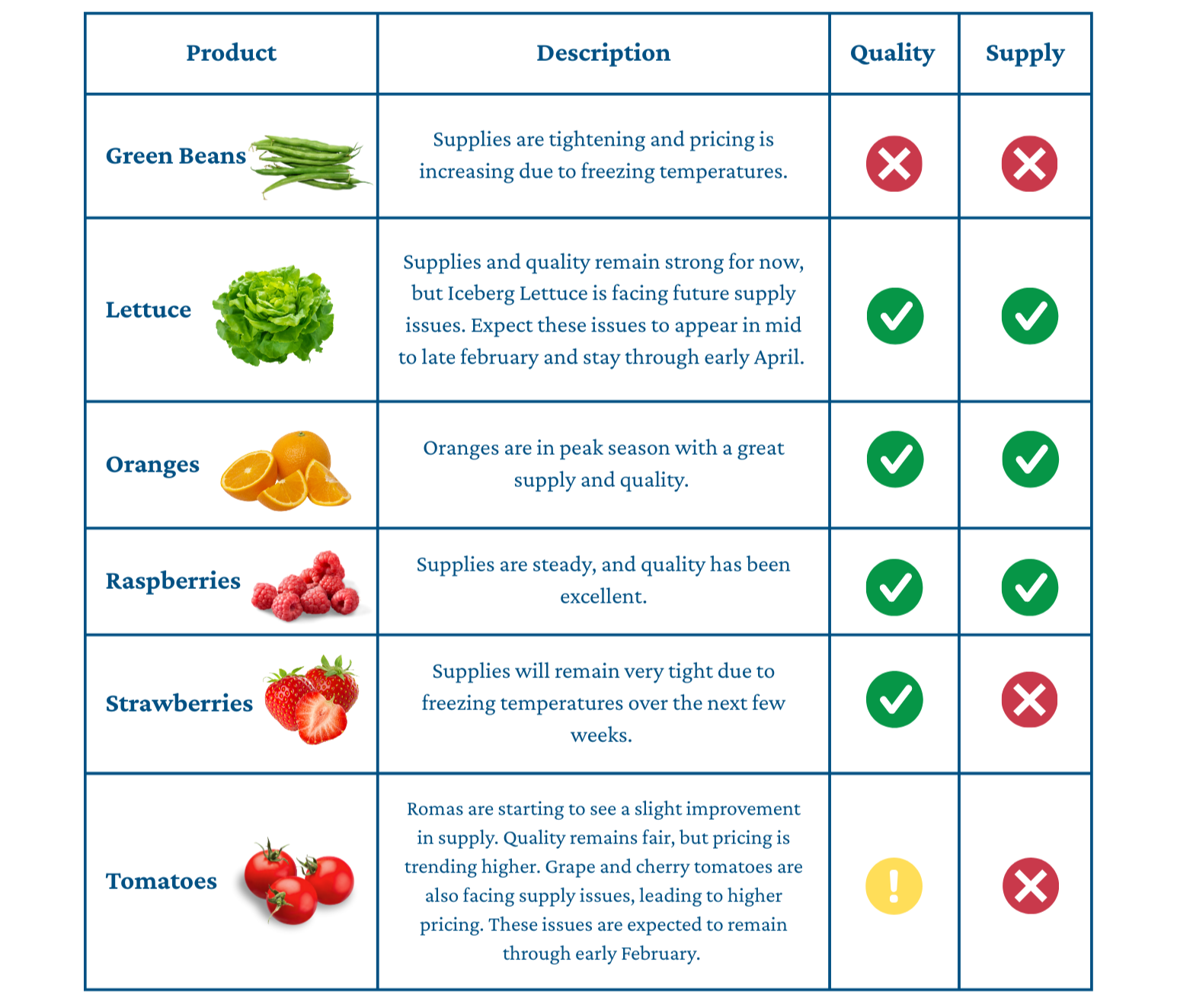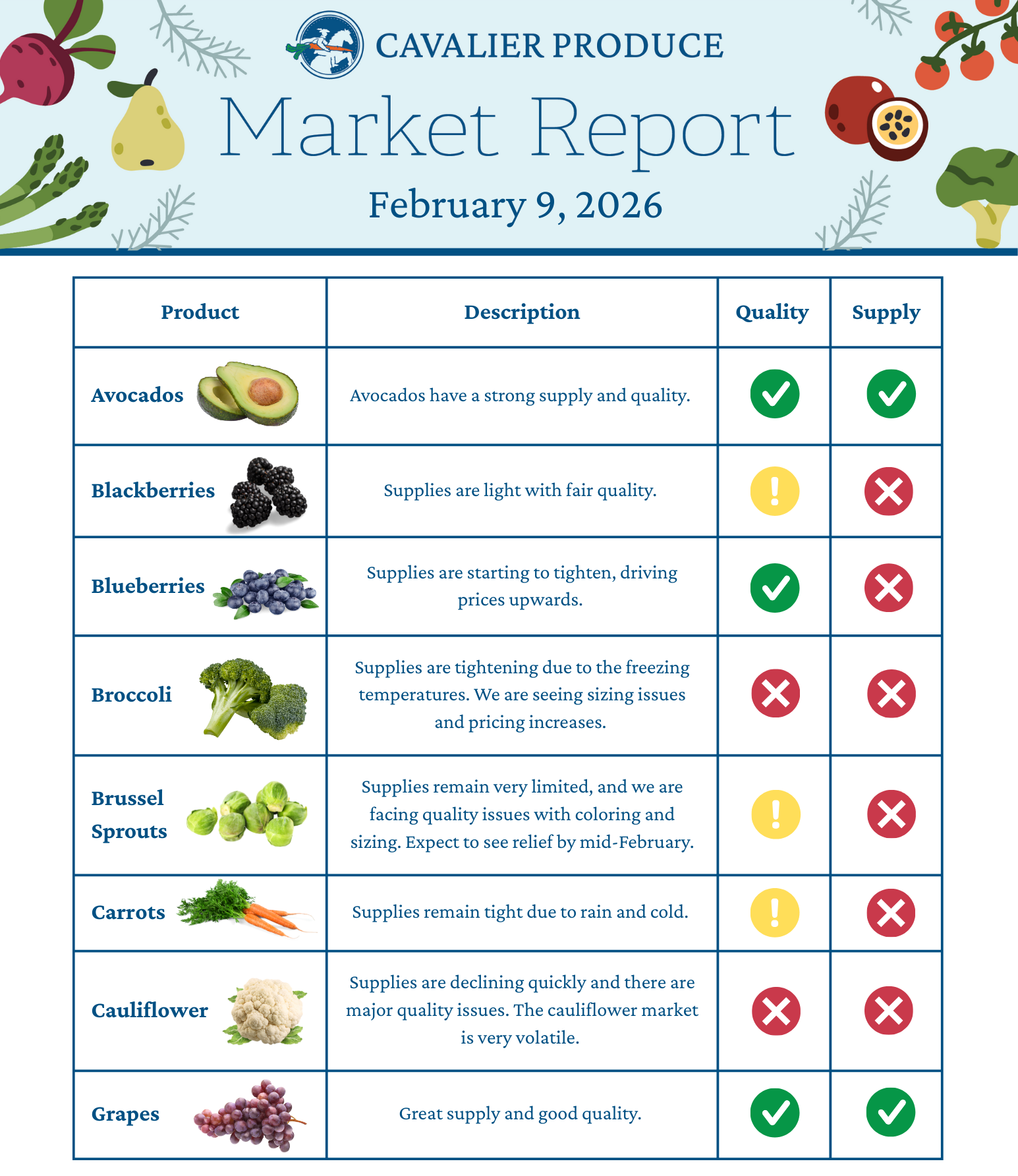 Welcome to this week’s Market Report from Cavalier Produce, your trusted wholesale produce distributor in Virginia. Each week, we share a visual snapshot of what’s available and what’s in peak season, with updates on quality and supply. Our goal as a local produce supplier is to help food buyers, chefs, and restaurant owners obtain the freshest produce to elevate their menu items.