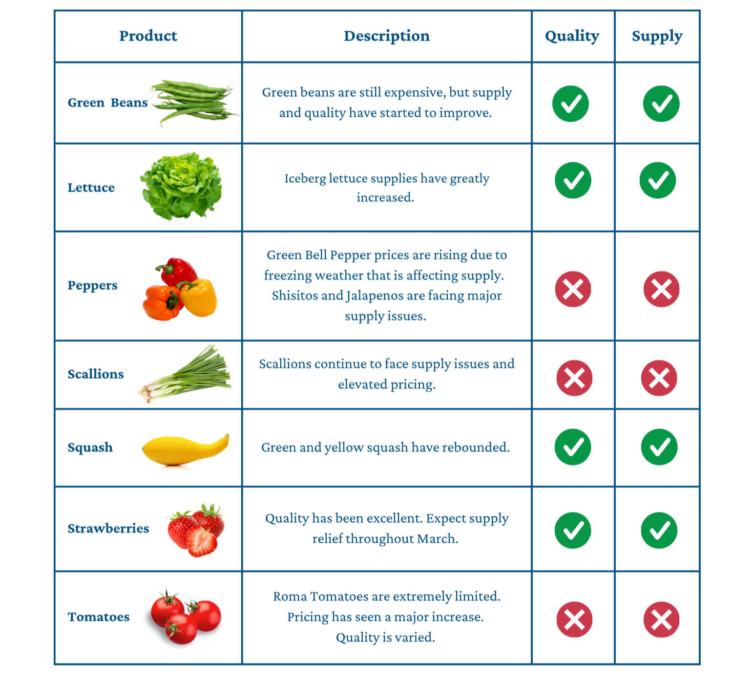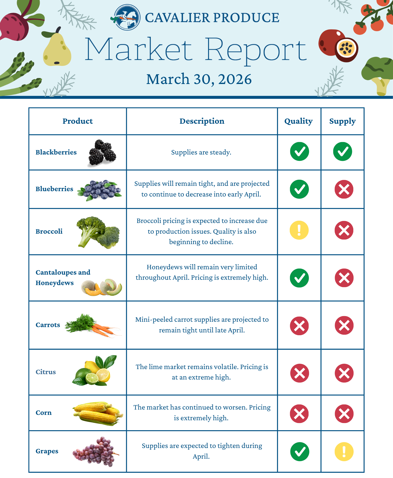 Welcome to this week’s Market Report from Cavalier Produce, your trusted wholesale produce distributor in Virginia. Each week, we share a visual snapshot of what’s available and what’s in peak season, with updates on quality and supply. Our goal as a local produce supplier is to help food buyers, chefs, and restaurant owners obtain the freshest produce to elevate their menu items.